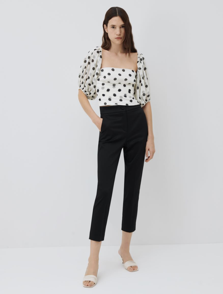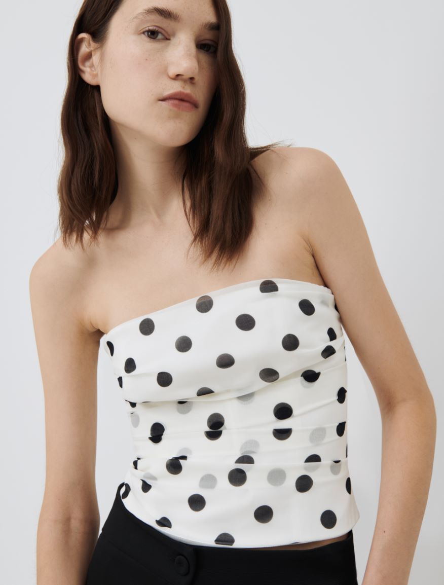 τοπ πουά σχέδιο και ντραπε. Ίσια λαιμόκοψη, αποσπώμενα μανίκια τριών τετάρτων με ελαστικούς ώμους